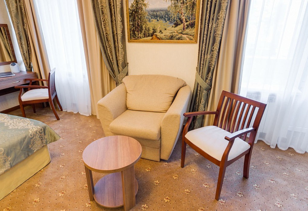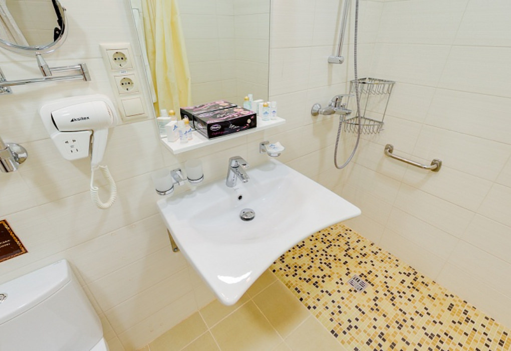 Площадь номера - 32 кв.м. 1 комната. 2 осн. места. уютный номер улучшенной комфортности полностью адаптирован для проживания маломобильных групп населения (лица с ограниченными физическими возможностями передвижения). Специально спроектированный номер оснащен всем необходимым: удобная ванная комната, дополнительные поручни, расширенные дверные проемы. Номер данной категории расположен на втором этаже здания. В номере: телевизор; холодильник; сплит-система; телефон; набор посуды; сейф; 1-спальные кровати; кресло; стол; чайник; шкаф. 1 доп. место: